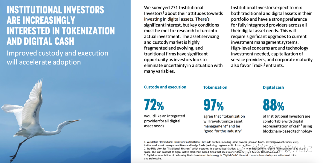 因此资产通证化(Tokenization)越来越被传统金融所接受,根据纽约梅隆银行(Bank of New York Mellon)的一份调研报告显示,在其采访的271家金融机构中有97%的机构认为通证化会给资产管理带来一场全新的变革[9],这充分的体现出了区块链在金融领域中的潜力。