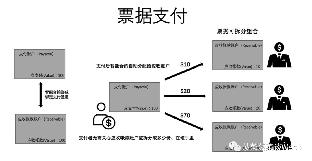 得益于使用 ERC-3525 进行通证化的现金流可编程能力,在“数字发票通证化”的场景中将支付票据进行通证化。通过 ERC-3525 创建一对账户:支付账户(Payable)和应收帐款账户(Receivable)。这两个账户之间像形成了一种类似于量子纠缠互相绑定的支付通道,只要买家向支付账户汇款,资金就会通过智能合约自动分发到应收帐款账户中。这意味着无论应收帐款被拆分为多少份,无论最终落入谁的手中,最后都会按照预定的比例转移到应收帐款账户中,这是在传统金融体系中成本极高且难以实现的操作,使用通证化技术可以大大增加了供应链金融保理业务的流动性和可组合性以及降低运营成本。