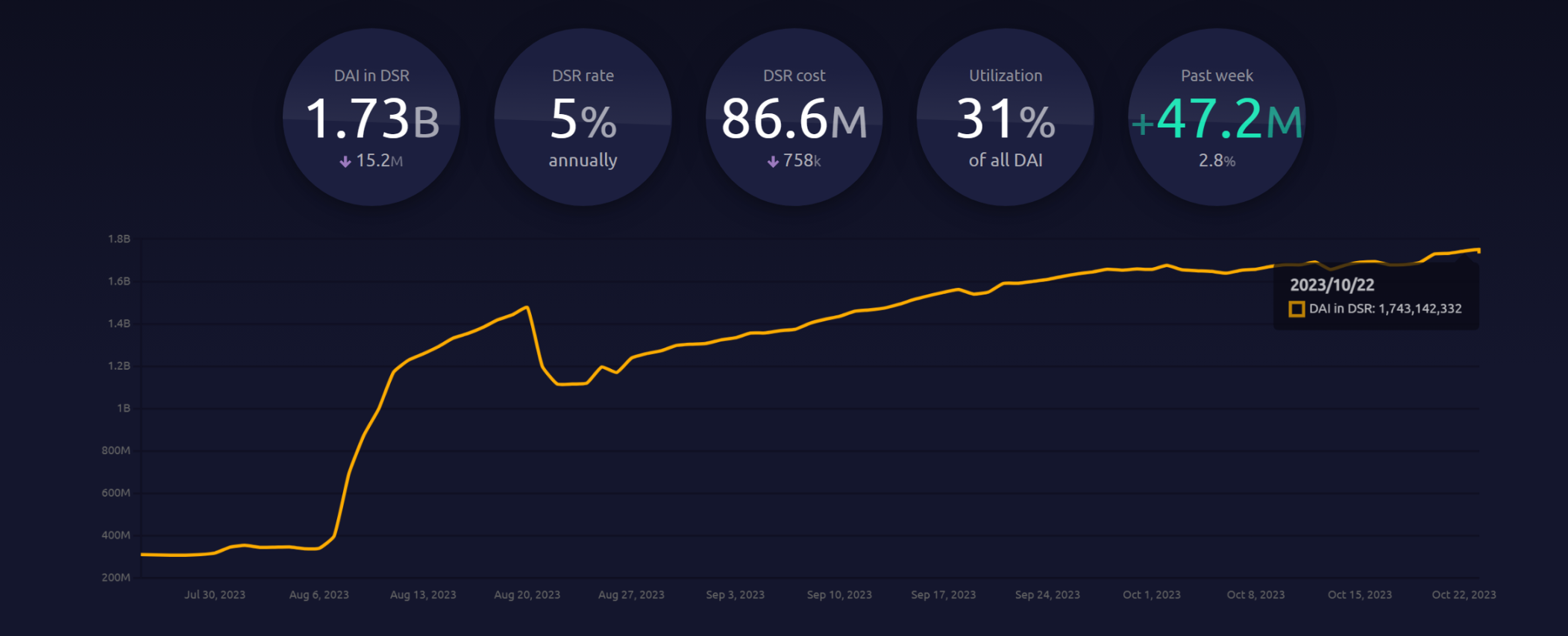 而目前增强型 DAI 储蓄利率(EDSR)为 5%,共计有 17.3 亿枚 DAI 在 DSR,使得 DSR 合约的整体利用率(存在 DSR 合约内的 DAI 数量 / DAI 总供应量)已远远超过 20% 的阈值,高达 31%。