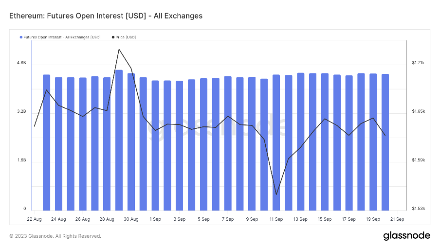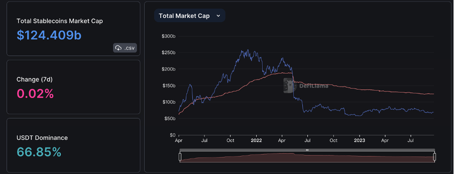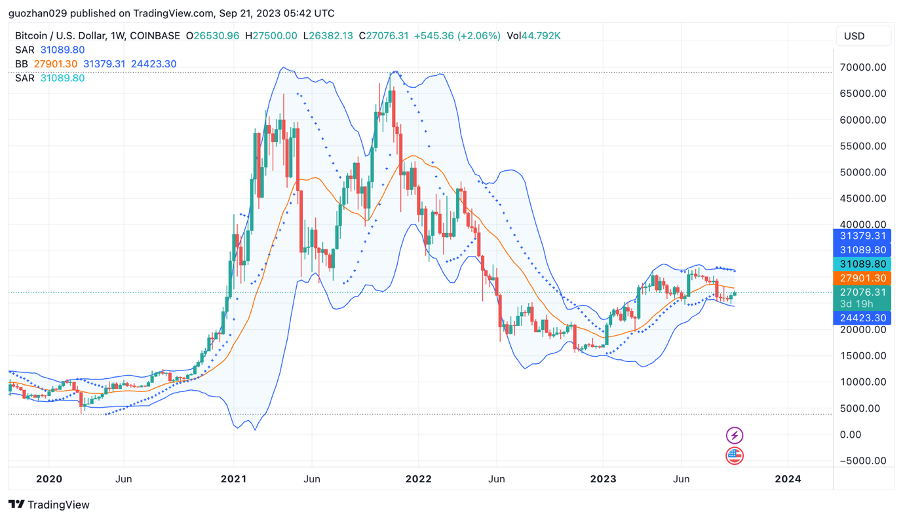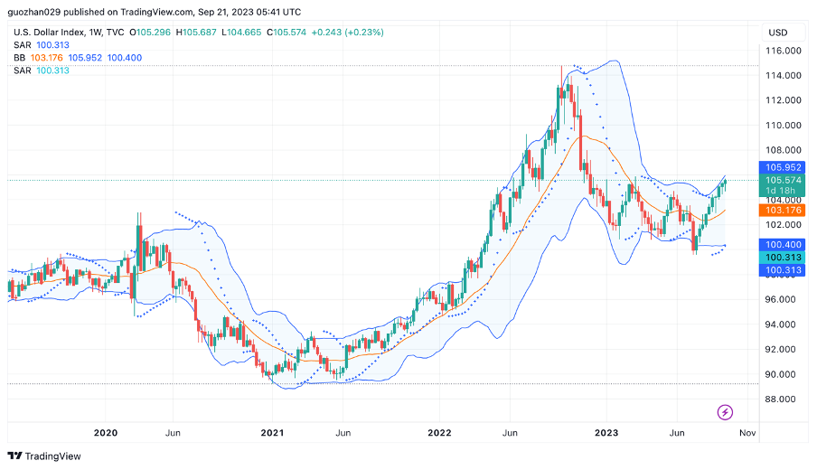 货币流动性趋紧。周三会议上美联储暗示年底前将继续加息,利率需要在更长时间维持高水平。市场预期降息从明年 6 月推迟到 9 月,即是牛市阶段推迟。因为美国经济凸显了超预期的韧性,美联储不能给高通胀卷土重来的机会。美元指数月线突破大涨,压制风险类资产。美股大跌破位,加密市场弱势反弹。