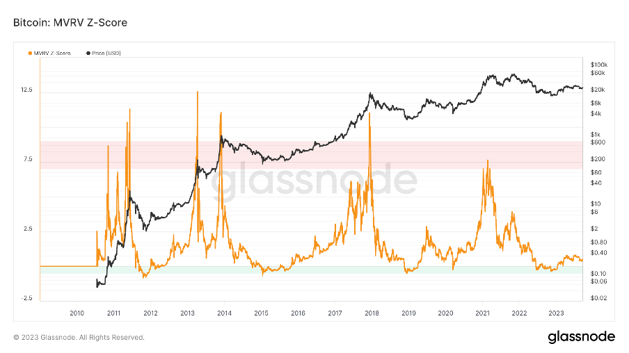 长期趋势指标 MVRV - ZScore 以市场总成本作为依据,反映市场总体盈利状态。当指标大于 6 时,是顶部区间;当指标小于 2 时,是底部区间。 MVRV 跌破关键水平1,持有者总体上处于亏损状态。当前指标为 0.5,进入复苏阶段。