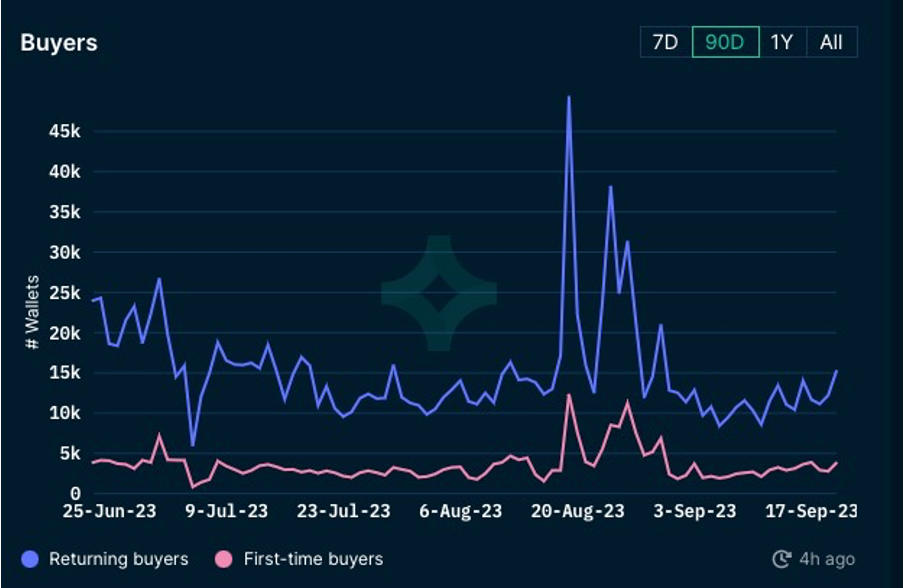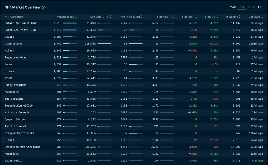 本周头部蓝筹项目地板价格起伏不大, BAYC 上涨 2.3%, MAYC 上涨 1.3%, DeGods 上涨 2.8%, Pudgy Penguins 上涨9.4%. 总钱包数量和复购买家均成上涨趋势, 整体市场行情有所好转, 初次购买者数量也有一定的反弹, 但价格还未能彻底走出低迷。
