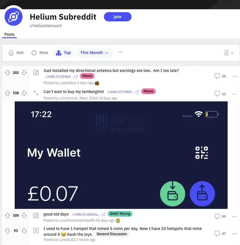 不仅如此,在 Helium 的 Reddit 社区看能到越来越多有关 Helium 回报率惨淡的言论。他们平均花费 400-800 美元购买了一个矿机(hot spot),总矿机销售额超 2.5 亿美元,节点们希望每个月能够获得 100 美元的回报。然而事实是单节点单矿机目前的月收入仅有 20 美元。