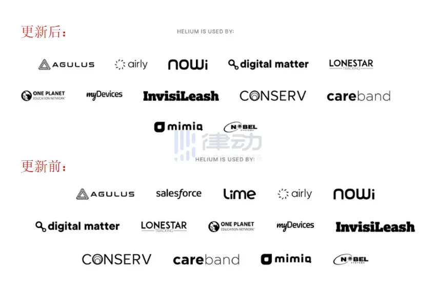据报道,Helium 多年来一直声称 Lime 正在使用其技术进行地理定位,而 Salesforce 的一位发言人也证实了该公司与 Helium 并没有合作。没有与 Lime、美国软件巨头 Salesforce 建立合作伙伴关系,Helium 却将这两家公司的徽标在网站上突出显示,这引起了社区的强烈不满。在社区和「合作伙伴」的重重压力之下,Helium 官网页面将这两家公司 Logo 从合作列表删除。
