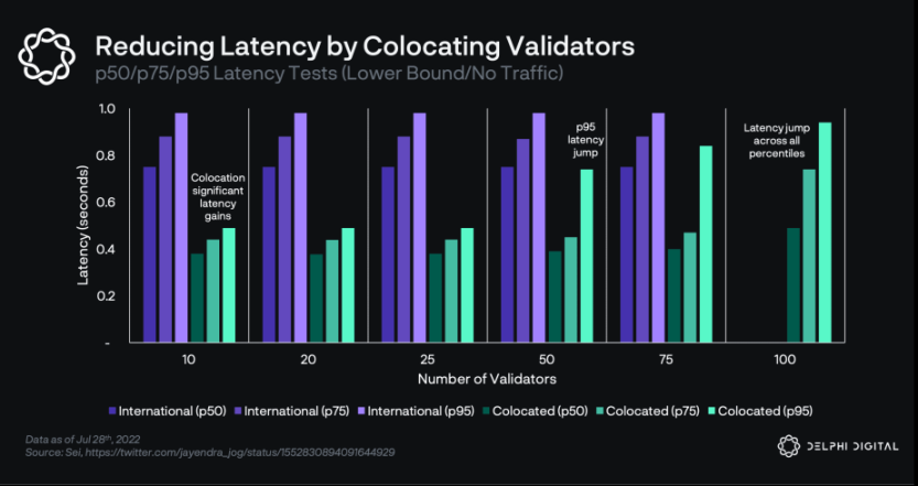 为什么要进行主机托管?如果验证器在地理位置上分散,信息的传输就需要更长的时间,也就导致在达成共识和产生区块时会有更高的延迟。订单簿交易平台需要尽可能地减少延迟。Sei 再次公布了他们围绕主机托管的一些测试结果: