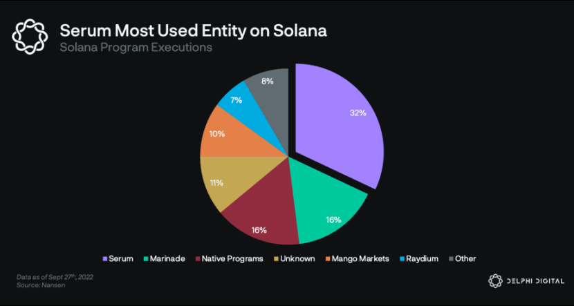 为了理解为什么会想在底层网络上做这些改变,我们可以看看 Serum 和 Solana。 Solana 是一个通用的 Layer 1 区块链,被宣传为「链上纳斯达克」,目标是 400 毫秒的区块确认时间和极高的吞吐量。Solana 的主要观点是,订单簿交易平台最终将接管 AMM,而 Solana 上的指标也支持了这个观点。Serum 是建立在 Solana 之上的订单簿应用,是 Solana 生态被使用最多的应用,占 Solana 上交易的的约 1/3。Serum 是 Solana 上的「订单簿层」,供 Mango Markets、Zeta、Atrix、Bonfida、Jupiter 等项目使用。当人们想到 Solana 时,他们通常会想到 Serum。