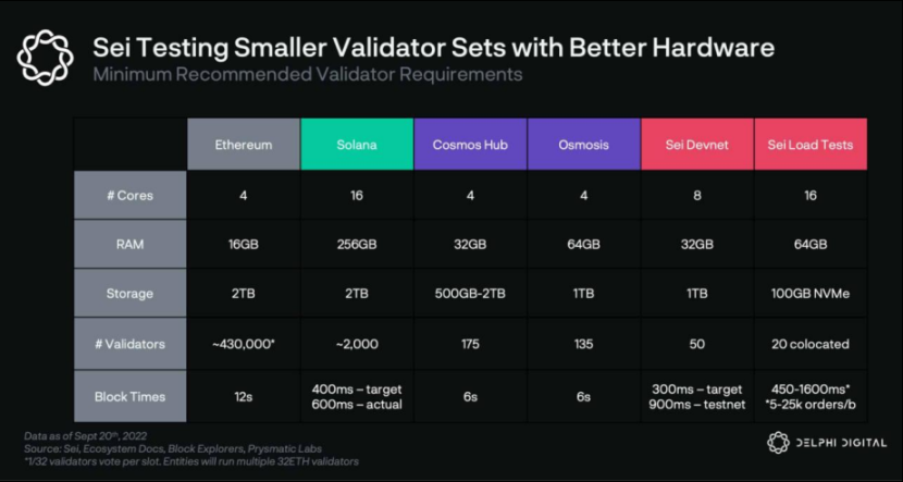 在 Sei 项目文档的第一个版本中,推荐的规格与标准的 Cosmos 链相似。之后硬件的要求被提高了,并且在特定的负载测试中,要求甚至被进一步提高。订单簿模型对硬件的要求很高,低性能的机器会降低网络的整体性能。虽然不是 Solana 级别的要求, 但 Sei 已经明确表示,他们希望他们的验证器能够超过常见的区块链。此外,他们正在推动验证器地理位置的集中化,以进一步减少延迟。