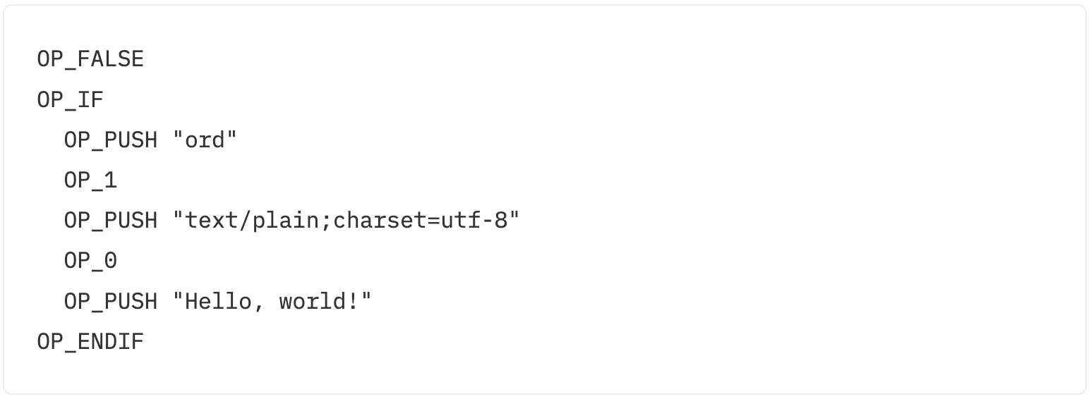 序数理论更多地是对 Bitcoin 的最小单位 sat 的追溯,它所设计的规则使得每个 sat 都有自己独一无二的编号。而基于序数理论,可以把链上一些独特的数据和这些 sats 关联起来,也就是”铭刻“铭文。铭文被存放在 taproot 脚本中,taproot 脚本对内容的限制很少,而且可以获得额外的见证折扣,这使得铭文的存储较为经济。铭文的 Taproot 脚本格式类似于: