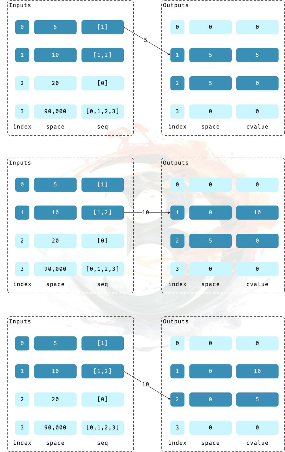 3. 输入 1 转移 10 个染色资产到输出 2 中,此时输出 2 中先减去 min(5, 10) = 5,转移到 2,且输入 1 是染色资产,所以 cvalue 加 5;