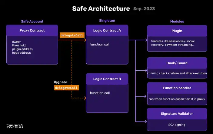 单例合约服务于 Safe 账户,并定义了不同的模块合约集成,包括 Plugin、Hook、Function Handler 和 Signature Validator。