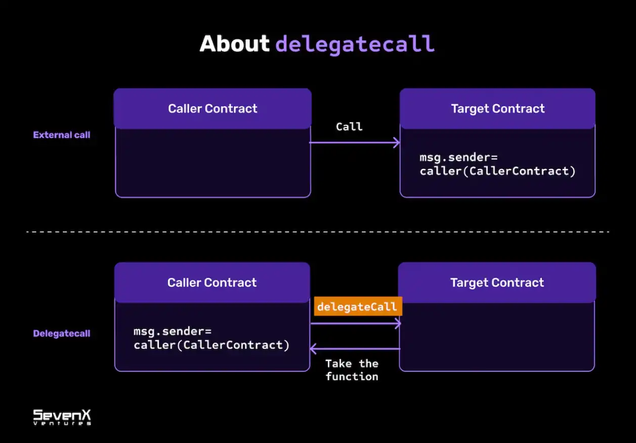 虽然「委托调用」与「调用」类似,但它不是在目标合约的 context 中执行,而是在调用合约的当前状态的 context 执行它。这意味着目标合约所做的任何状态更改都会更改调用合约的存储。