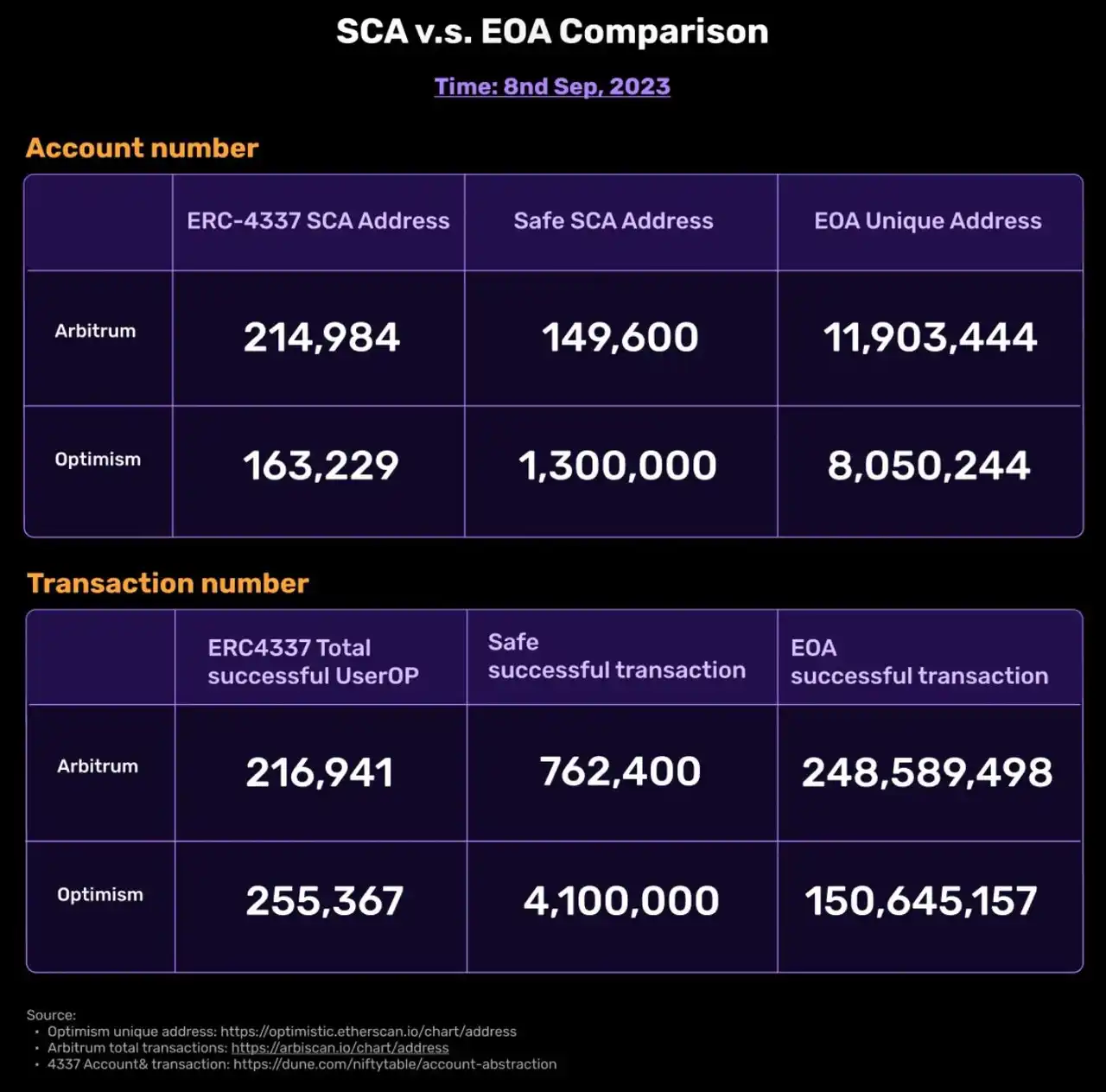 从外部拥有账户(EOA)向智能合约账户(SCA)的转变势头强劲,并已经得到了包括 Vitalik 等许多核心创业者的支持。尽管如此,SCA 的采用却并不像 EOA 那样广泛。这其中的主要问题包括熊市带来的影响、eoa 到 sca 的迁移难度、签名问题、Gas 成本过高以及最为关键的开发难题。