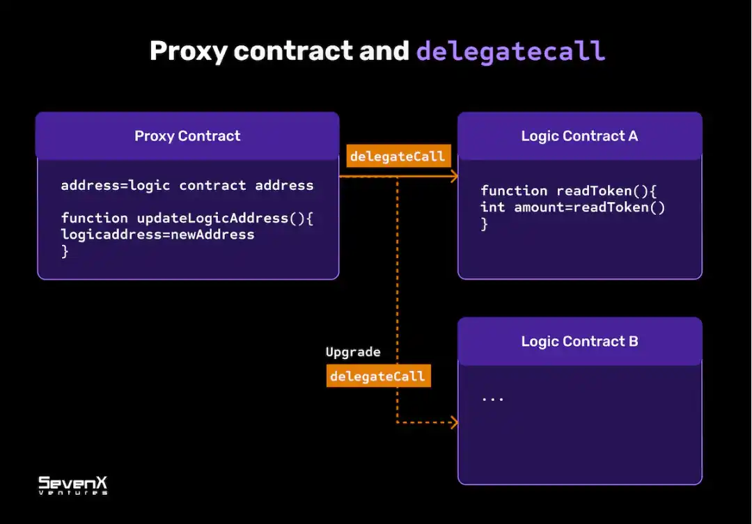 代理合约:普通合约存储其逻辑和状态,部署后无法更新。而代理合约使用委托调用(delegate call)部署到另一个合约。通过引用实现函数,在代理合约的当前状态下执行它。