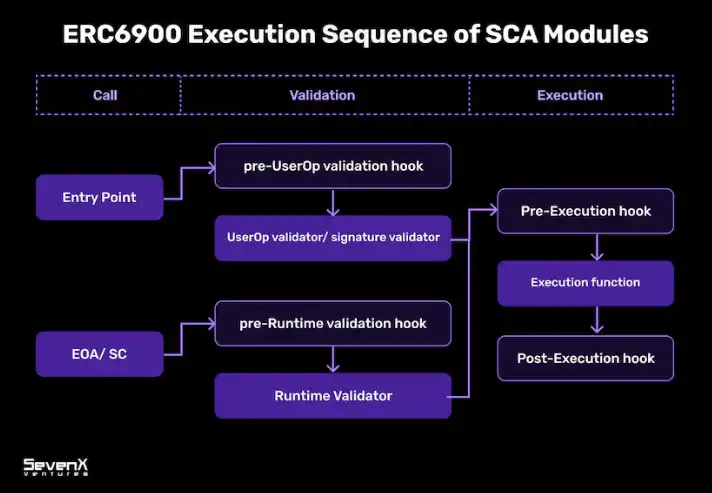 说到 AA 的交易流程,主要有三个流程:验证、执行、挂钩。正如我们前面所讨论的,这些步骤都可以通过使用代理帐户调用模块来管理。虽然不同的项目可能使用不同的名称,但掌握相似的底层逻辑很重要。