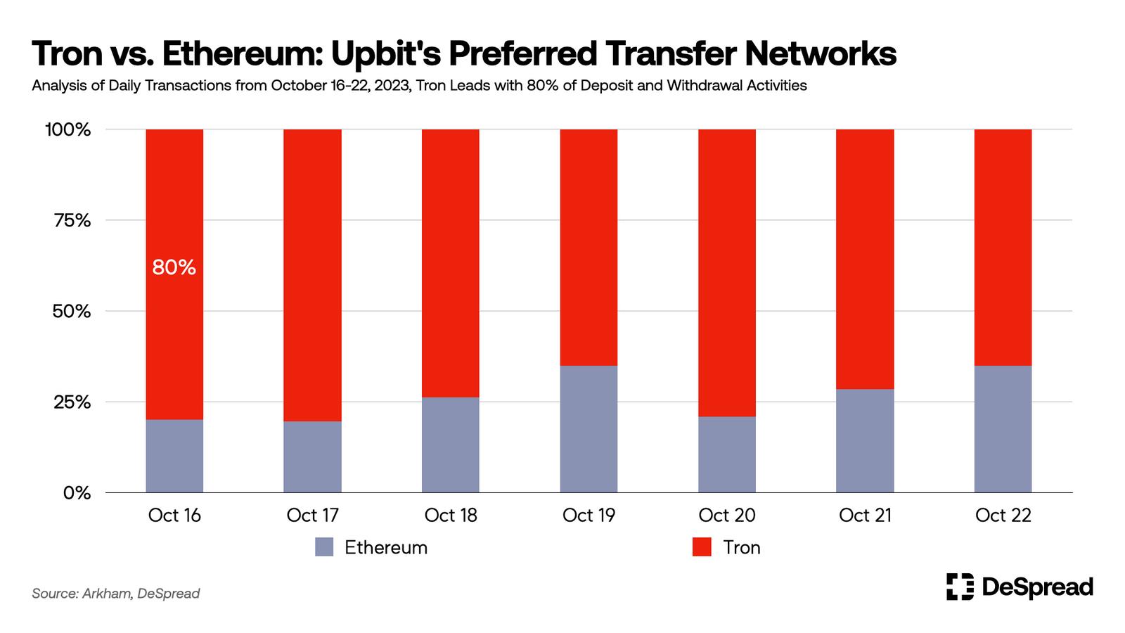 Upbit 用户更喜欢使用 Tron 网络:上面的图表显示了过去一周内 Upbit 用户在以太坊和 Tron 网络上用于存款和提款的交易比例。从数据来看,Tron 网络上的交易数量是以太坊的 5 倍。