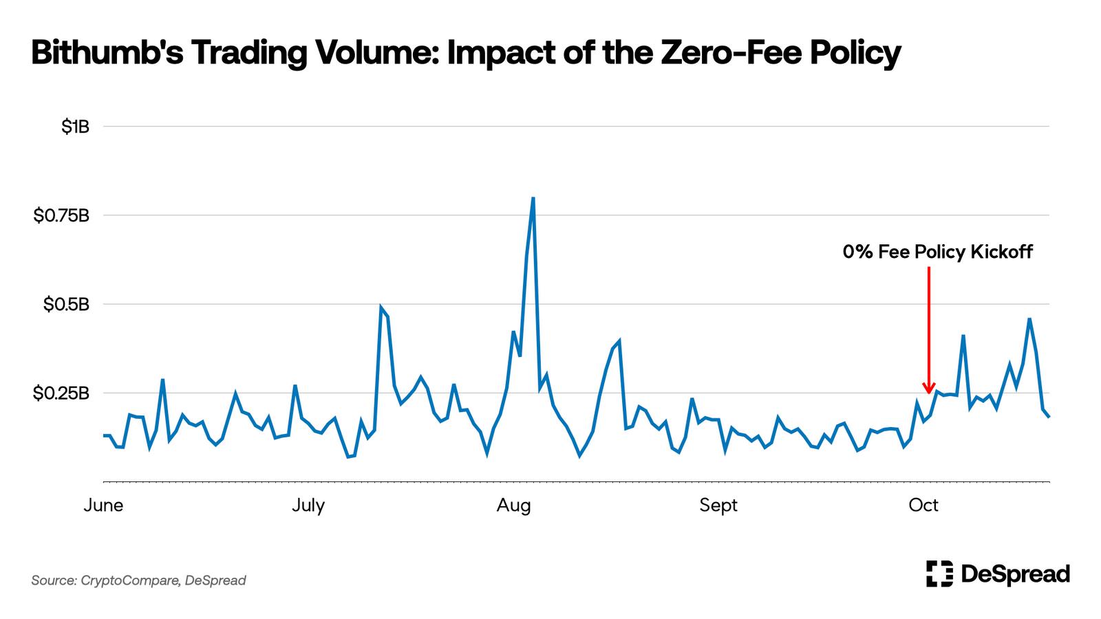 对零费用政策的初步反应:Bithumb,韩国的第二大交易所,在 10 月 4 日实施了 0%的费用政策。这一政策初步产生了积极效果,Bithumb 的交易量增加,其市场份额超过了 20%。