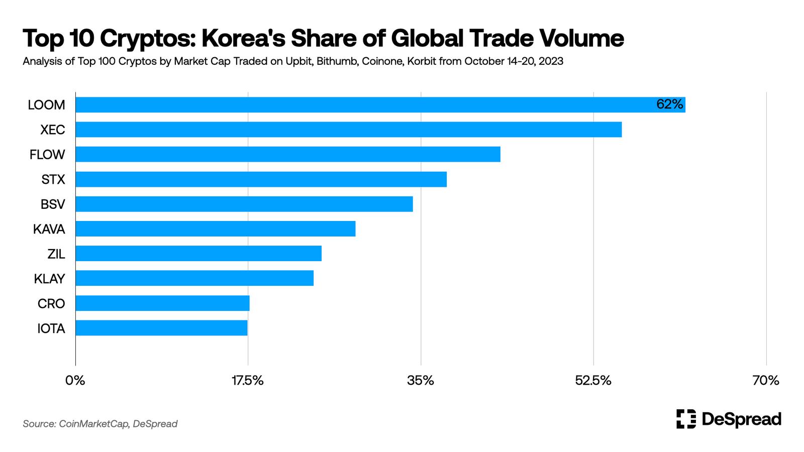 韩国投资者喜欢的币种:上面的图表展示了韩国投资者主要关心哪些币种。通过分析上周在韩国与全球市场相比最活跃交易的加密货币数据,我们发现 Loom Network ($LOOM) 以 62%的市场比例,获得最高的交易量,位居首位。其次是 eCash ($XEC)的 55%和 Flow ($FLOW)的 43%。Stacks ($STX) 和 Bitcoin SV ($BSV) 也进入了排行榜,分别为 37%和 34%。
