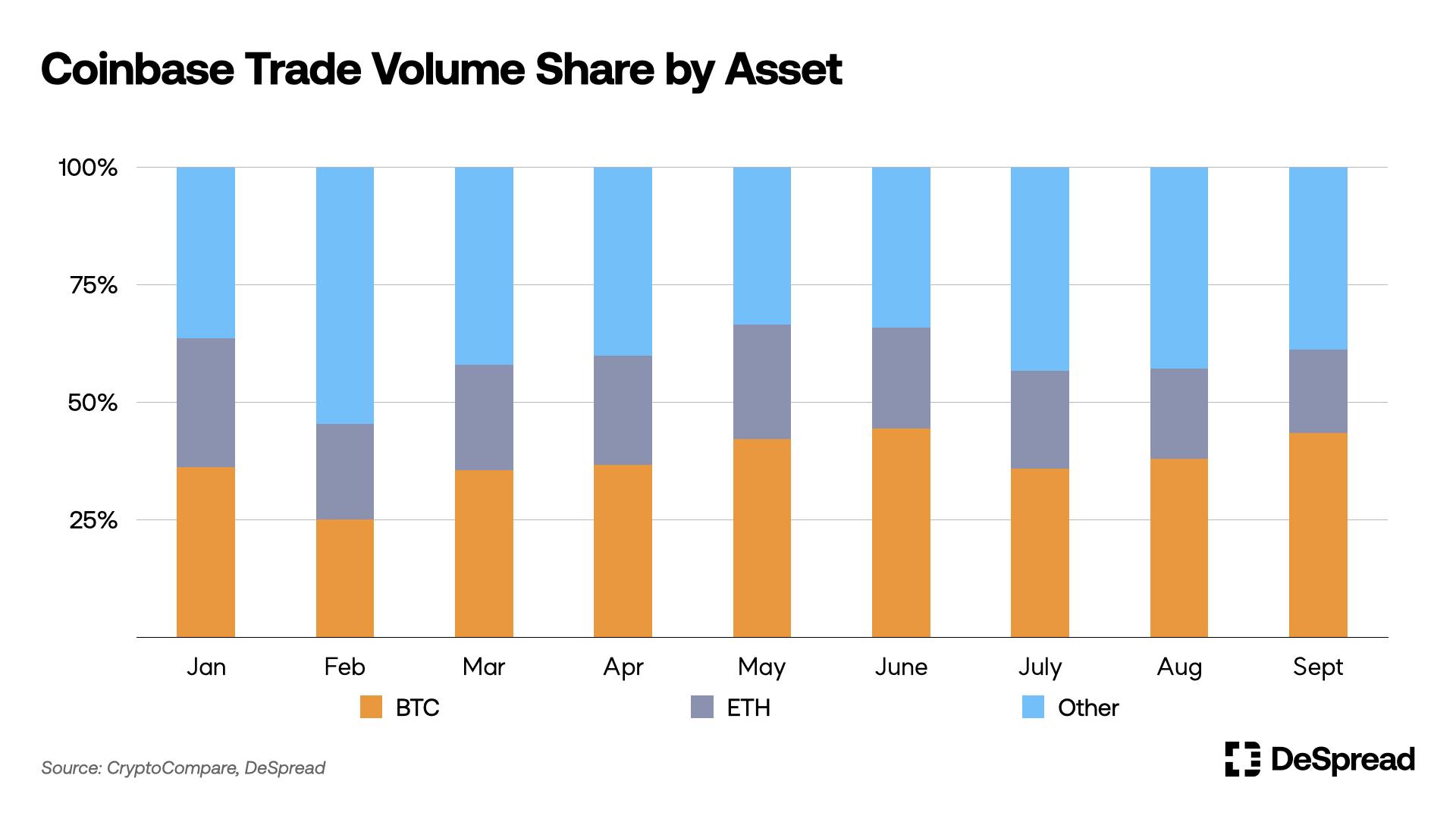 以机构投资者为中心的交易:与 Upbit 不同,Coinbase 的交易量主要受到机构投资者的推动。根据 Coinbase 的第二季度股东信,机构投资者约占 Coinbase 总交易量的 85%。他们倾向于追求投资组合的稳定性,这就是为什么在加密货币中市值最高的 BTC 和 ETH 的交易占据了相对较高的比例。