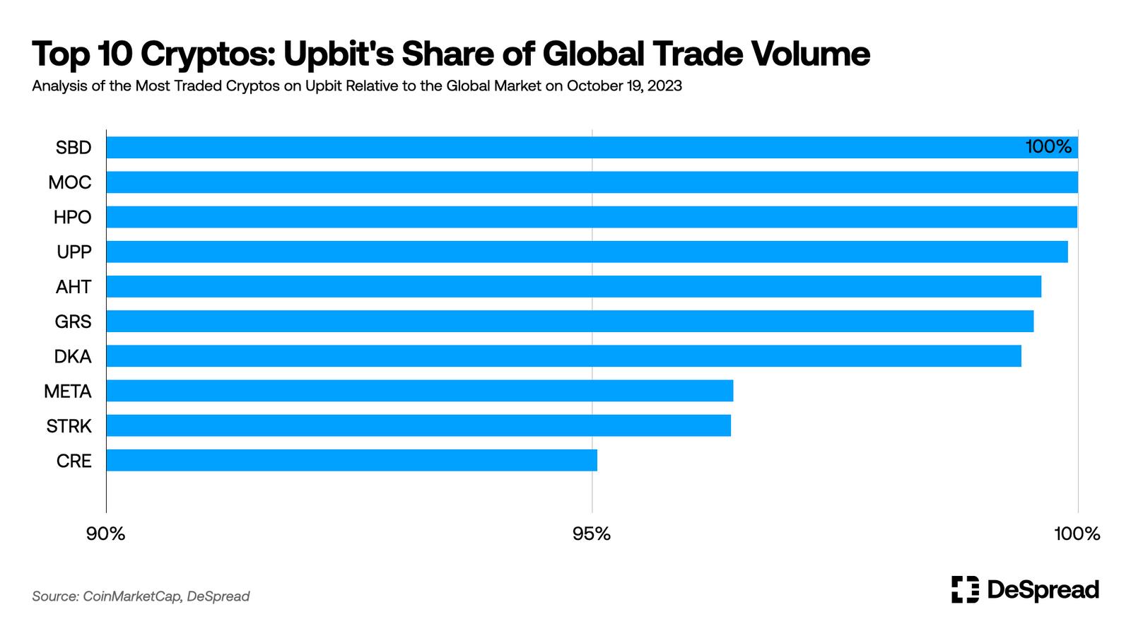 主要在 Upbit 上交易的“泡菜币”:在 Upbit 交易的加密货币中,Steem Dollars ($SBD)、Moss Coin ($MOC) 和 Hippocrat ($HPO) 占了交易量的 100%并且只在 Upbit 上独家交易。此外,像 Sentinel Protocol ($UPP)、Aha Token ($AHT) 和 Groestlcoin ($GRS) 这样的加密货币主要在 Upbit 上交易,并被称为“泡菜币”,因为它们在全球市场上没有得到太多关注。这些币种主要由韩国投资者交易,并在 Upbit 平台上形成了自己的市场。
