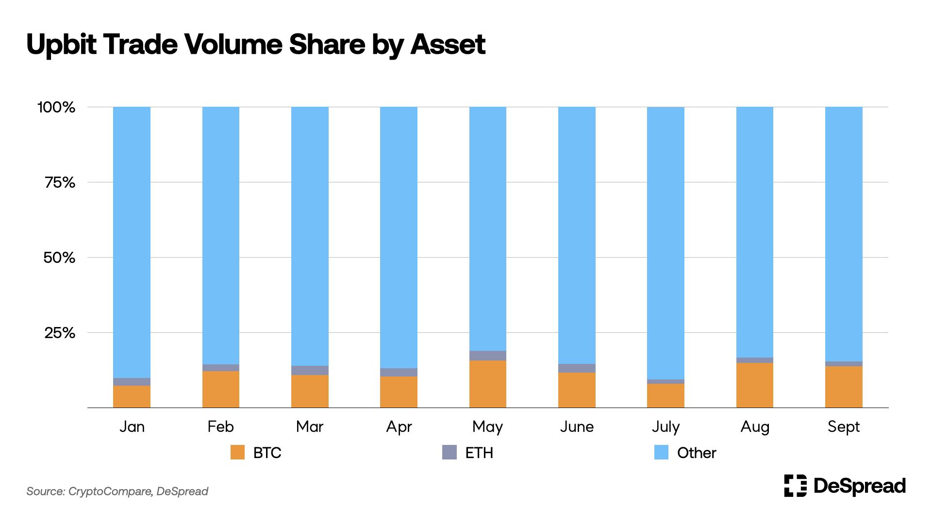 市场份额增长趋势:此外,四大韩国交易所的市场份额一直在稳步增加。与 Binance 的交易量相比,从 3 月的 7%增加到 9 月的 16%。这可以被理解为国内交易所影响力增加。