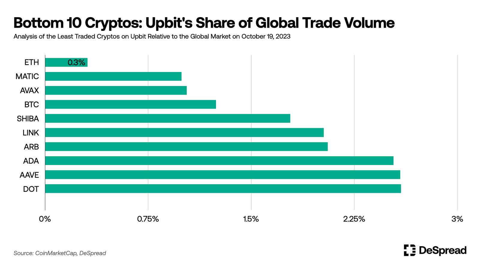 主流币种的表现相对不佳:在全球市场上占主导地位的加密货币,如比特币 (BTC)、以太坊 (ETH) 和 Polygon (MATIC),在全球范围内都有大量的交易量。然而,在 Upbit 内,它们的交易量出奇地低。这种现象表明,与全球市场相比,Upbit 具有独特的特点,并反映了投资者偏好和投资策略在地区之间的差异。然而,应该注意,与 Binance 这样的全球巨大交易所相比,Upbit 的总交易量相对较低,因此这些主要加密货币的低交易量也应该被考虑在内。
