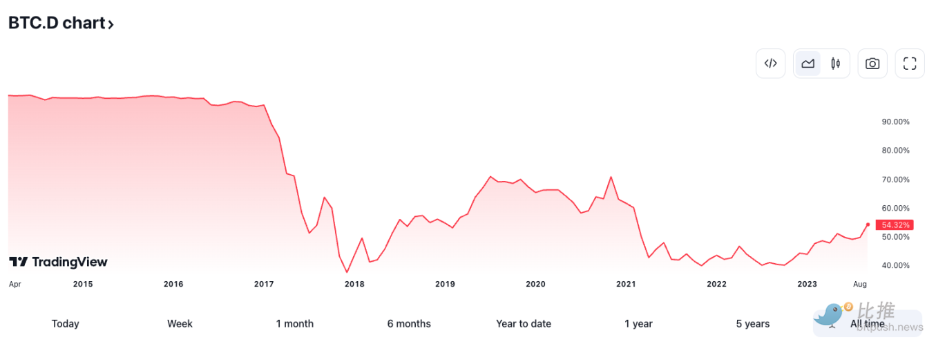 与此同时,比特币涨幅继续击败大多数山寨币,推动其主导地位飙升,比特币占加密总市值的比例升至 54.4%,为 2021 年 4 月以来的最高水平。超过 50% 的比率意味着比特币的市值超过所有其他加密货币的总和。