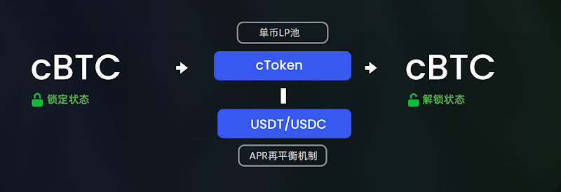 以 BTC 为例,比如当我们将 1 枚 BTC 代币质押到对应的溢价池中时,会获得 1 枚 cBTC 代币,但 cBTC 是锁定的。我们需要通过为 cBTC 提供流动性(cBTC需要额外购买),来将 cBTC 代币从锁定状态变为解锁状态(可交易),以从中获得收益。