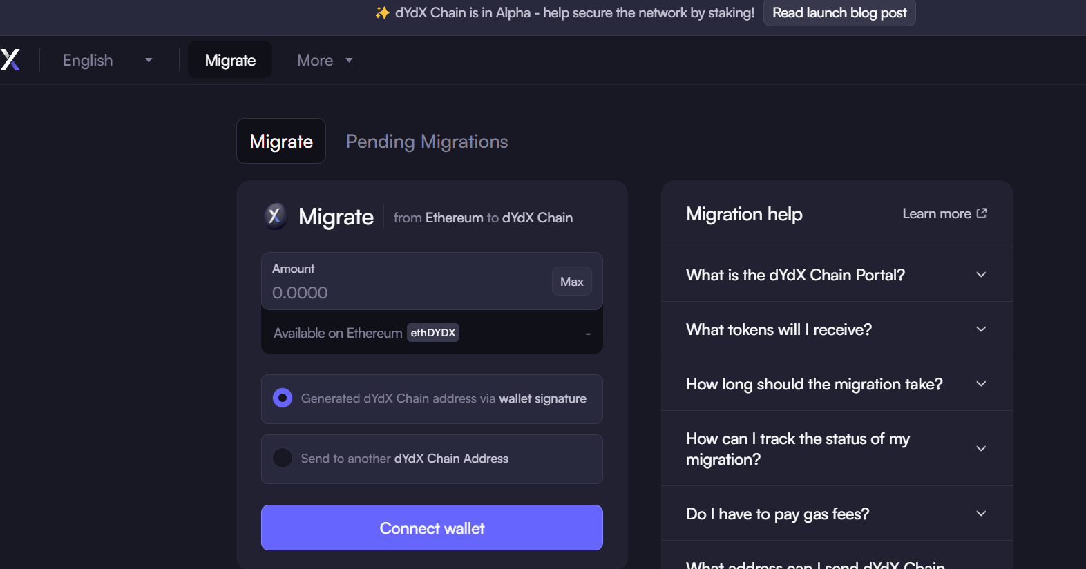 dYdX Ops subDAO推出的跨链桥接页面“bridge.dydx.trade”就是用来解决这个问题的,支持将以太坊上的ERC20格式的DYDX代币迁移至dYdX Chain上。需要注意的是,这个桥接页面是单线程的和特定的,仅支持从以太坊转移DYDX代币到dYdX Chain。