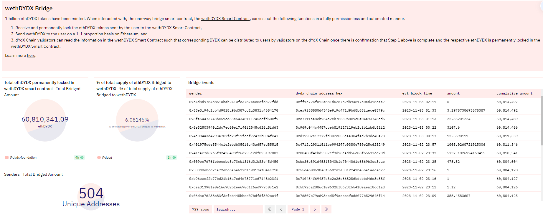 根据Dune数据显示,截至11月3日,目前该资产跨链桥已经桥接了超6000万的ethDYDX,在DYDX代币总供应量(10亿枚)占比约6%,参与的钱包地址数突破500个。