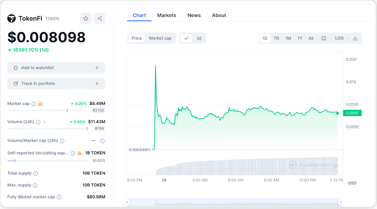 Tokenfi的一夜成名除了得益于Floki的社区基础,也有Bitget上暴力上涨的推波助澜。