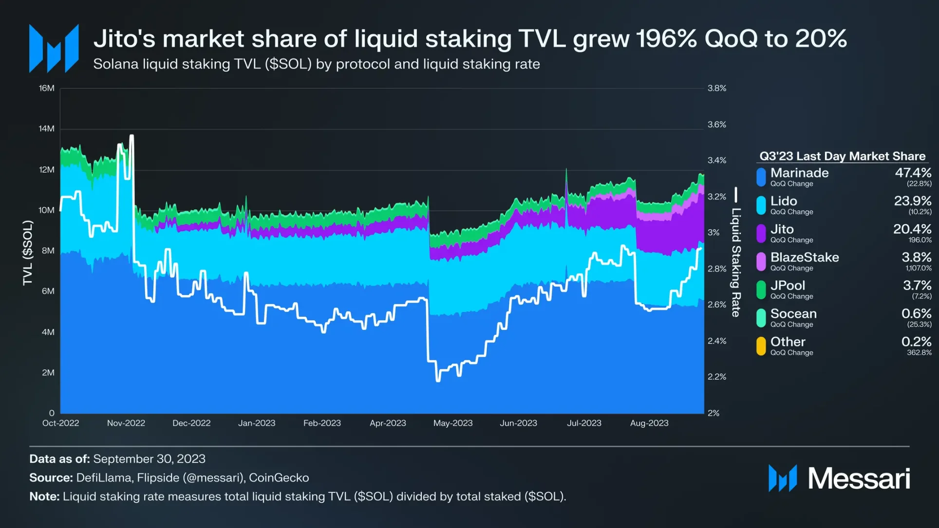 继 8 月底推出推荐计划后,Jito 于 9 月中旬推出了积分系统。与 Blaze 一样,Jito 奖励 JitoSOL 持有者并提高他们的 DeFi 活动积分奖励。Jito 在 SOL 中的 TVL 环比增长 227% 至 240 万(截至 2023 年 9 月 30 日为 4,880 万美元)。截至本季度末,约 35% 的 JitoSOL 存放在程序中而不是钱包中,而本季度初这一比例为 13%。