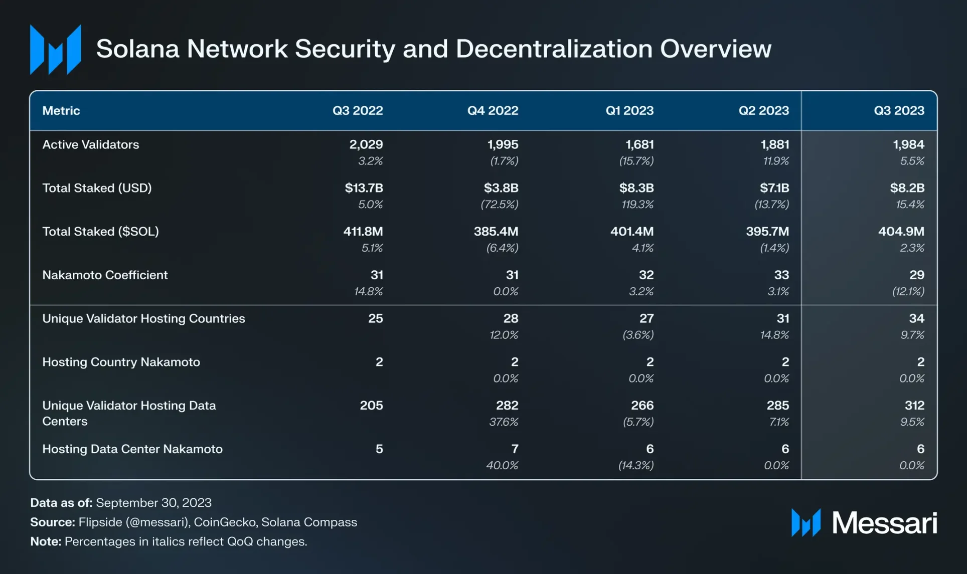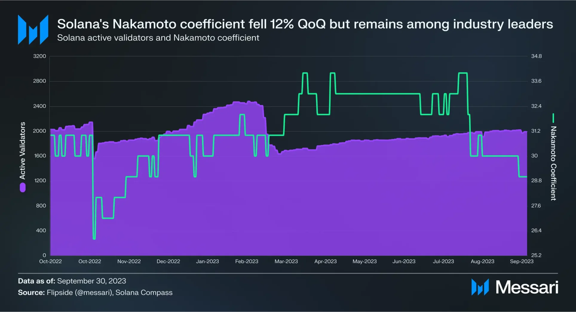 Solana 的中本聪系数环比下降 12% 至 29,但仍处于行业领先地位。验证者数量略有增加,环比增长 5.5%,达到 1,984 人。Solana 基金会在 10 月份的验证者报告中指出,计划对委托程序进行更改,以鼓励提高节点质量,而不仅仅是数量。委托程序中有超过 7300 万枚 SOL。