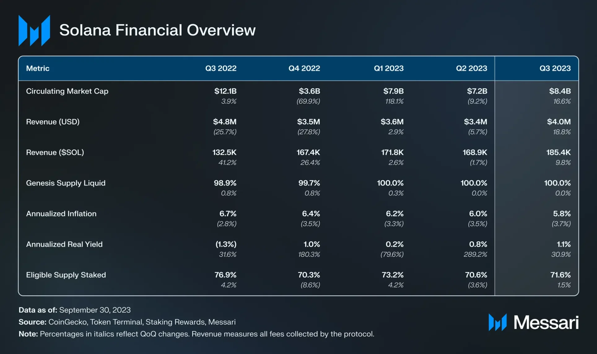 SOL 通货膨胀率将每年下降 15%,直到稳定在 1.5%。截至撰写本文时,有资格质押的 SOL 供应量中有 71.6% 已质押。请注意,Solana Labs 或基金会持有的代币尽管未被锁定,但并不全部算作流通。由于名义收益率高于通货膨胀率,且并非所有代币都被质押,SOL 的年化实际收益率在本季度末为 1.1%,环比上涨 31%。