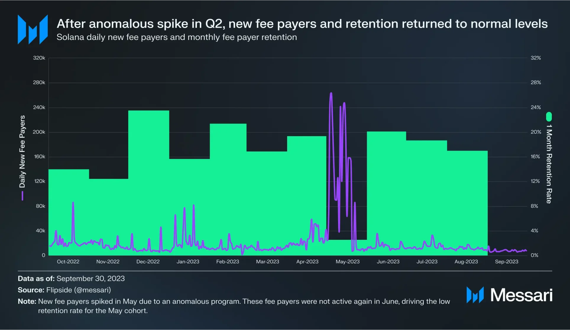 平均每日新增付费人数环比下降幅度更大,下降 76% 至 11,400 人。然而,由于未知程序的异常活动,第二季度的数据有所上升,该程序在 5 月中旬创建了大量新地址。而到 6 月,这些新地址就不再活跃了,导致 5 月份的月留存率低至 2.5%。第三季度的平均一个月留存率为 17.9%,与上一年基本一致。
