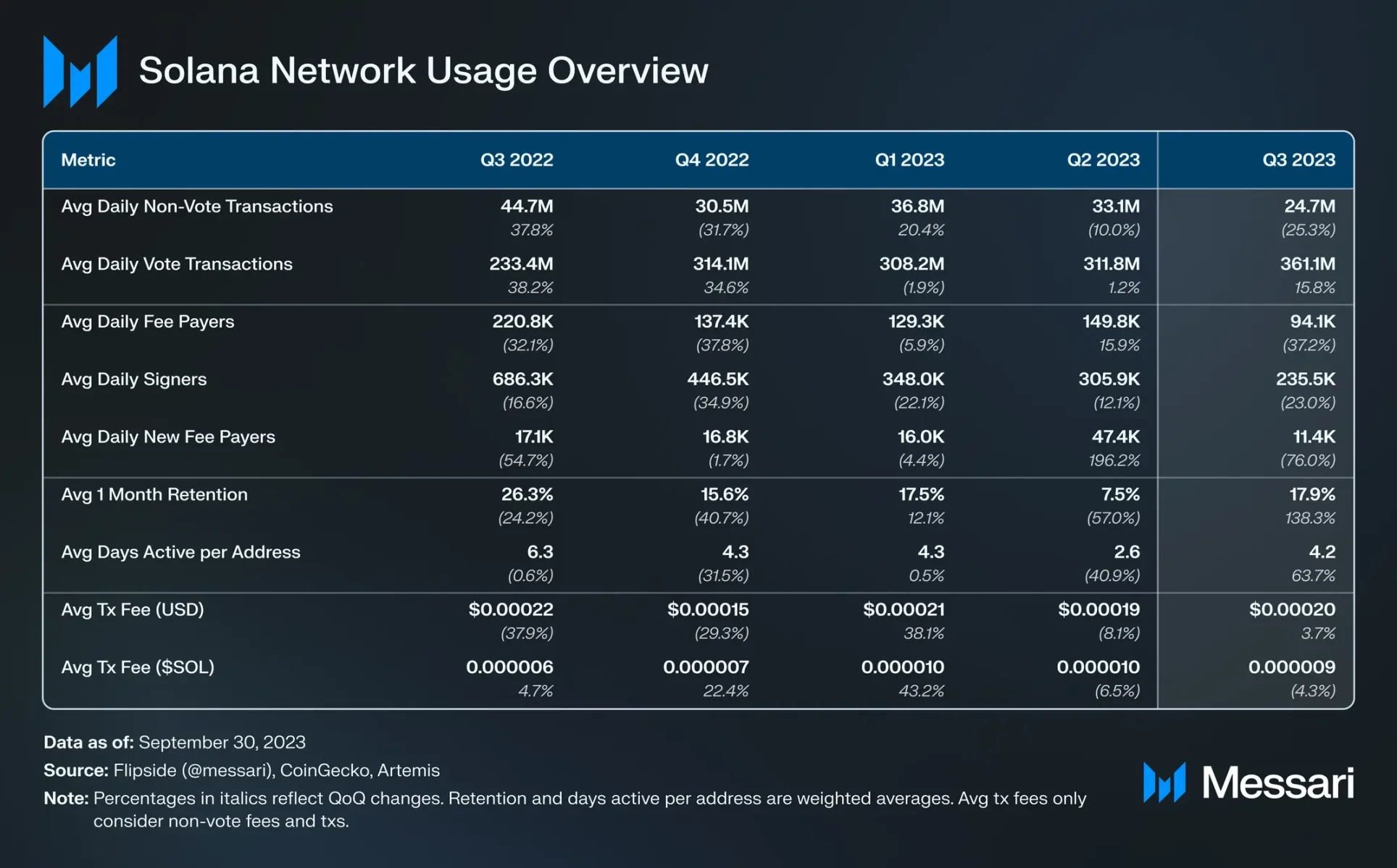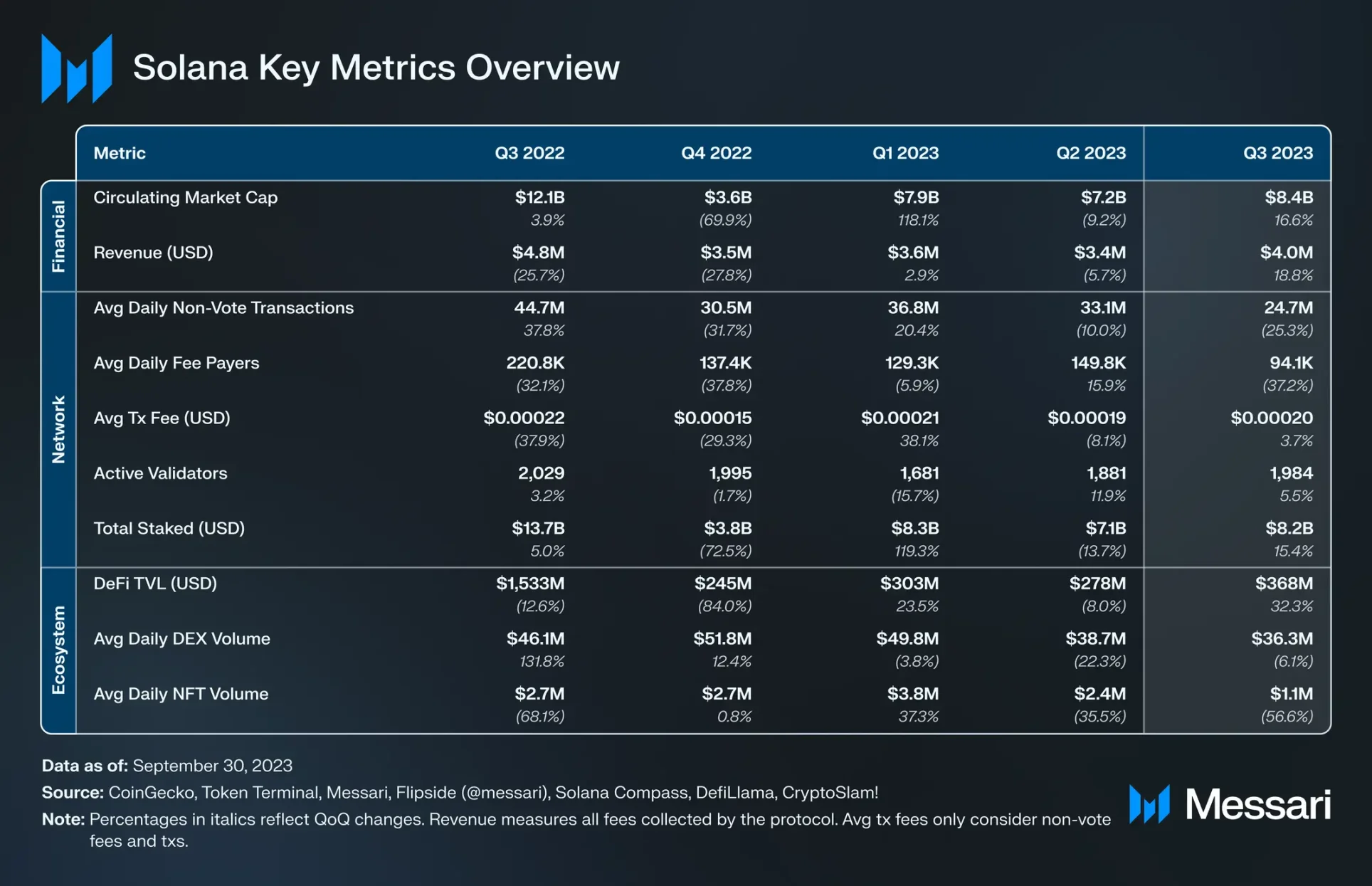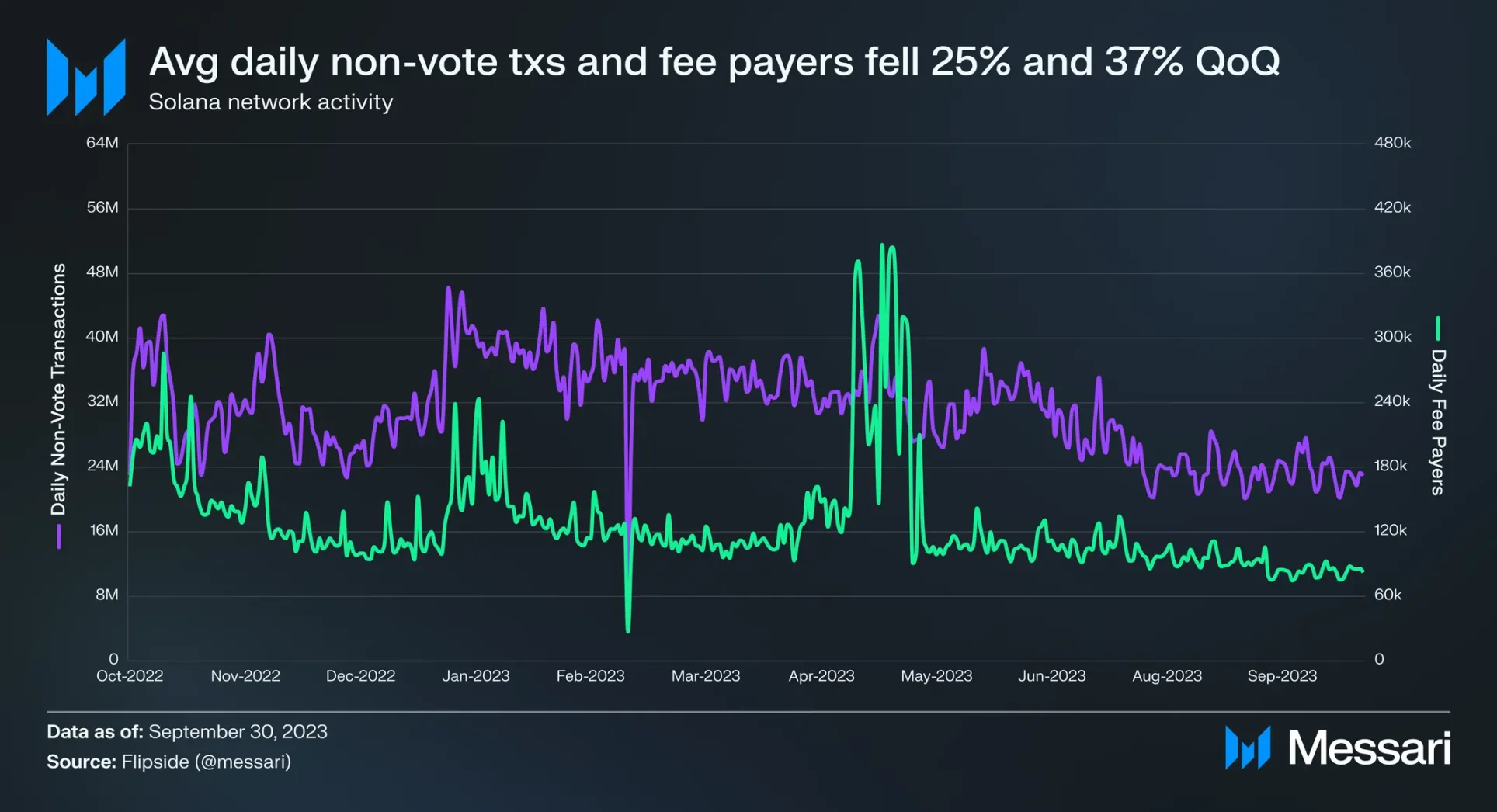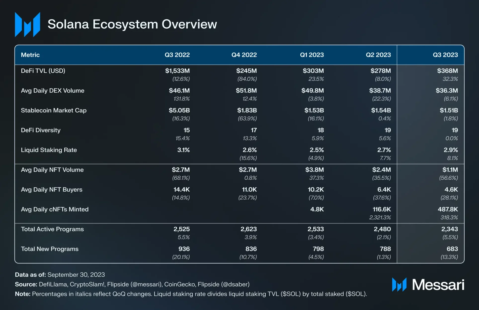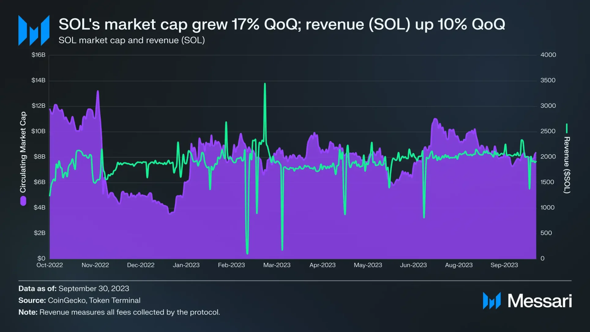 Solana 的基础技术也正在赢得外界的关注和采用。第三季度的例子包括 Rune 探索 MakerDAO 的 Solana 分叉的贴文、Eclipse 推出支持 SVM 的 L2 以及 Visa 在 Solana 上的支付集成。此外,Solana 的技术在本季度继续改进。V1.16 升级降低了验证器内存要求,引入了机密传输功能,并改进了对 zk 证明的支持。