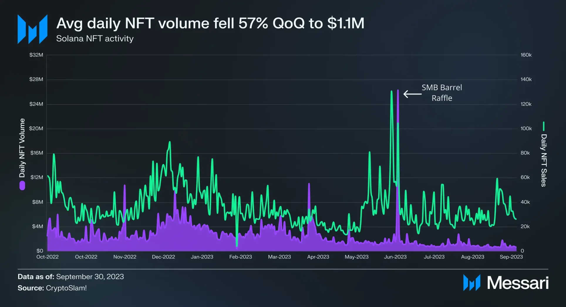 在第二季度最后一天 Solana Monkey Business 抽奖活动带来的激增之后,Solana 上 NFT 日均 交易量环比下降 57% 至 110 万美元,销售额和独立买家数量也环比下降。