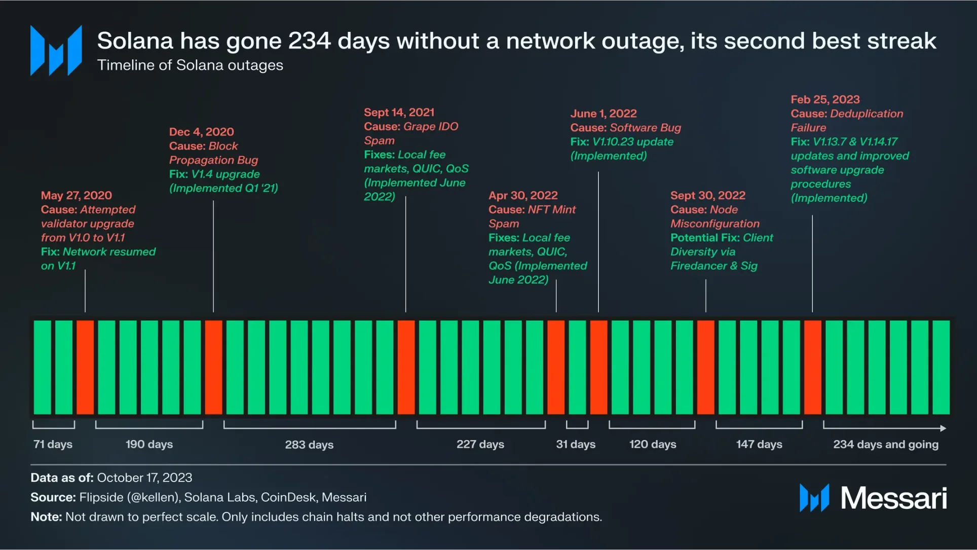 Solana 网络自 2 月 25 日以来一直保持在线状态,目前持续在线时间已接近历史高点。这种改善是升级流程改进和去年推出的新技术功能的结果,例如 QUIC、权益加权服务质量和本地费用市场。