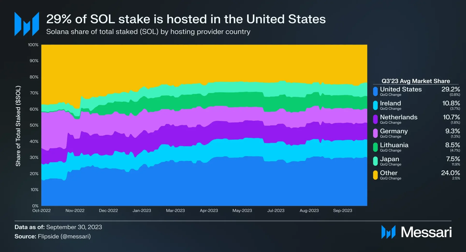 Solana 验证者遍布 34 个国家,环比增长 10%,同比增长 27%。美国以 29% 的质押份额领先,略低于 33.3% 的门槛,Solana 的地理中本聪系数为 2。Solana 基金会在其最近的验证者报告中表示,计划解决美国在过去一年中质押份额增加至接近 1/3 门槛的问题。