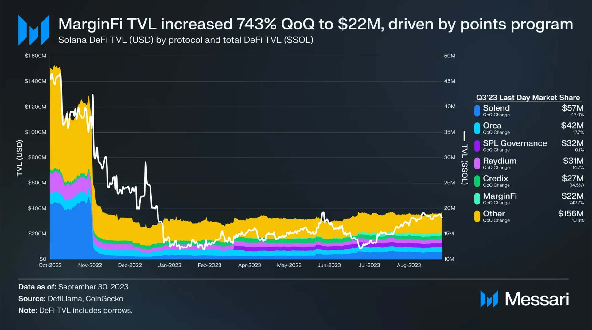 Maple 回归:在 FTX 崩溃,停止 Solana 上的开发后,Maple Finance 于 9 月初重返 Solana,带来了现金管理解决方案。该产品向 DAO 和高净值个人提供美国国债收益率(需要支付 0.5% 的管理费)。截至本季度末,Maple 在 Solana 上的 TVL 达到 420 万美元。
