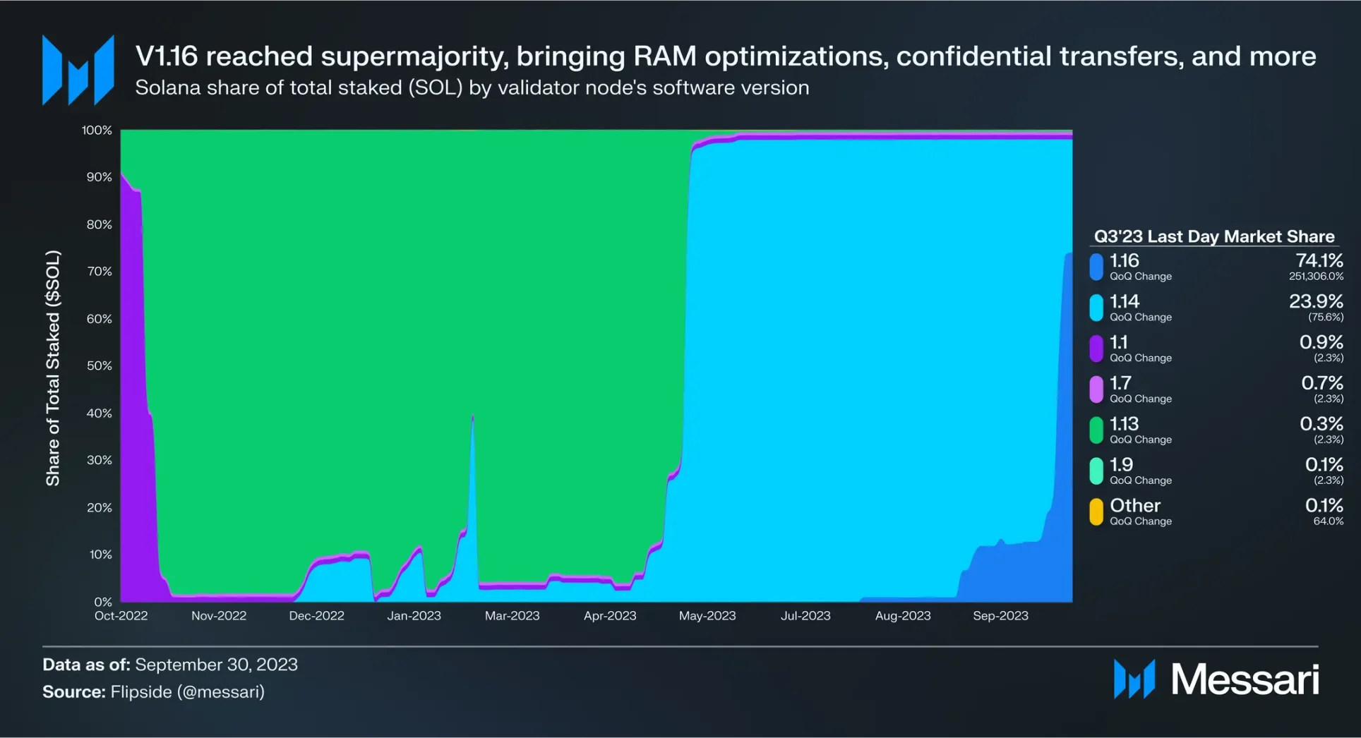 验证者于 8 月底开始切换到最新的 V1.16 版本。虽然中间出现了一些小错误,但在社区的帮助下得到了解决。到 9 月 28 日开始的 Epoch 510,绝大多数验证者都在运行新软件。验证者注意到升级后内存显着减少。除了 RAM 优化之外,V1.16 中的其他新功能还包括: