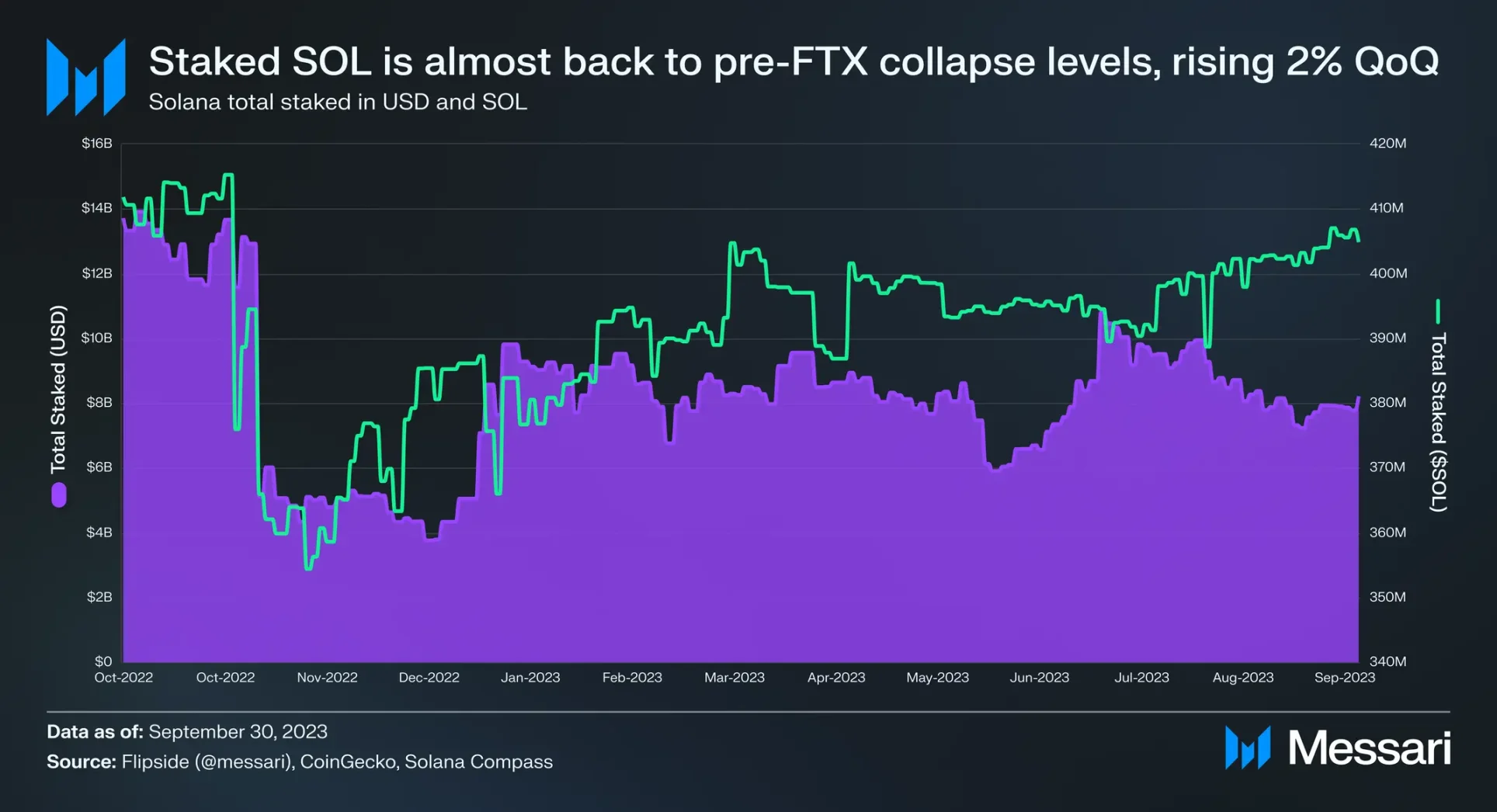 本季度 SOL 质押总量增长 2% 至 4.049 亿。就总质押市值而言,Solana 以 82 亿美元稳居第二,仅次于以太坊。SOL 质押数量几乎回到了 FTX 崩溃前的水平。