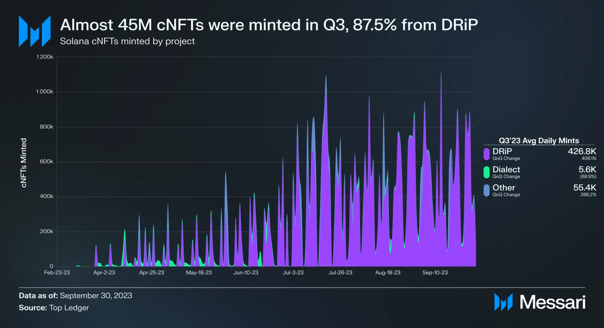 第三季度铸造了近 4500 万枚 cNFT,环比增长 316%。DRiP 占据了这些 cNFT 铸造 87.5% 的市场份额。DRiP 与艺术家合作免费提供艺术 NFT 铸造 ,系列规模远大于正常的 10,000 个。8 月中旬,DRiP 宣布获得由 Placeholder 领投的 300 万美元种子轮融资。