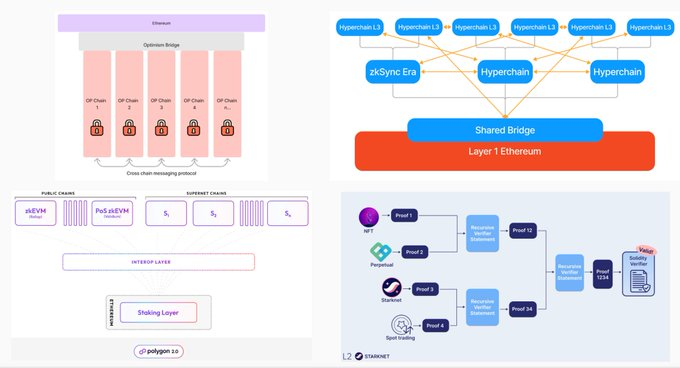 以下是 @ zksync 的超级链、@ OxPolygonDeFi 的超级网络和 @ Starknet 的架构设计的示例。核心概念是:‘无限’扩展、共享桥接,以及在每个单独的 Rollup 之间聚合成本。