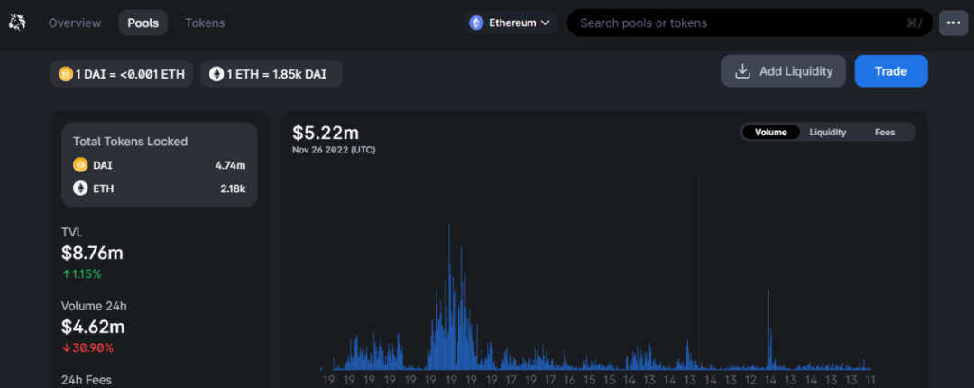 1)协议首先吸纳$1m ETH和$1m DAI组池,其中 80%的 DAI 存入 DSR ,20% DAI 和 ETH 进行组池