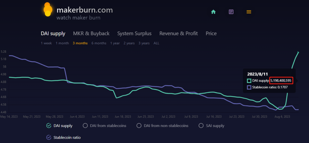 根据 MakerBurn 数据,过去 4 天内 DAI 供应量由 4 4 亿增长至 52 亿。显然,这是由于 DAI 的8%的高额利率直接拉动的。