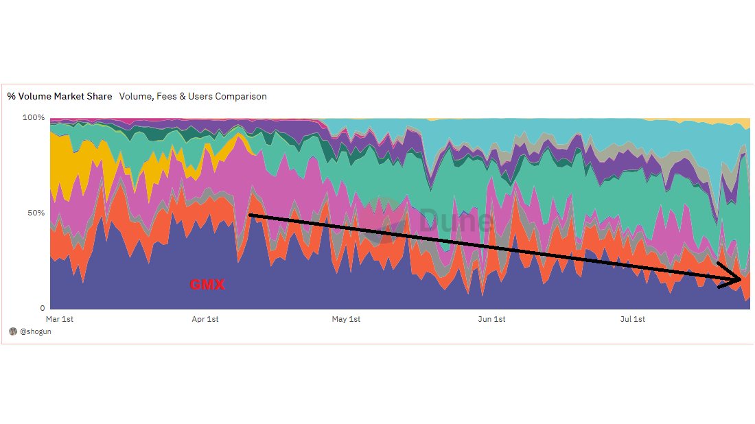 随着竞争的加剧, GMX 市场份额正在逐渐减少,如果 v2 不能给平台带来更多的交易量和费用, GMX 的合理价格可能会落到 40 美元区间,市盈率大约为20。