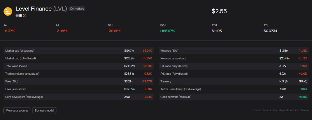 由于使用 LVL 代币进行了大量交易激励, Level Finance 协议在早期受到了很大的市场关注。 目前 Level Finance 协议的交易量一直维持在数十亿美元的水平,但由于代币的发行量和价格下降,一些关键指标处于下降趋势。