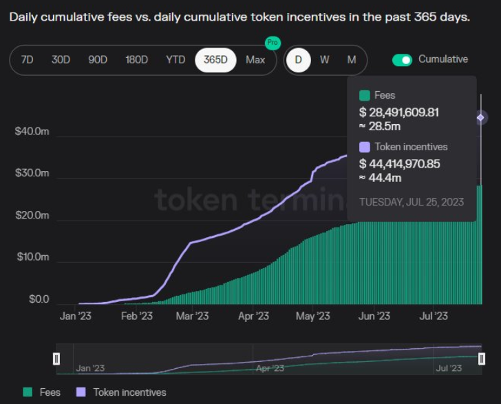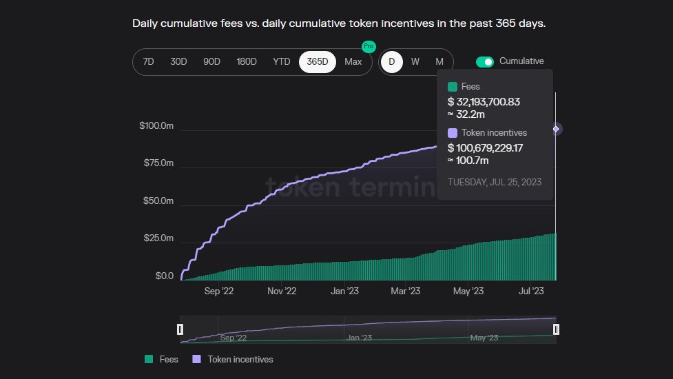 考虑到 Level Finance 具有与 GMX 类似的设计,交易额/锁仓量比值达到 1000 似乎有点过高(可能有人为因素导致),需要注意的是,尽管 Level Finance 产生了大量费用收入,但收益却是负数——这意味着该协议分发的代币多于产生费用的代币。