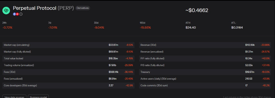 Perpetual Protocol 构建在 Uniswap v3 智能合约之上,目前其80%的费用收入分配给流动性提供者,约14%分配给 PERP 代币质押者。 Perpetual Protocol 年收入为 140 万美元,而解锁代币的价值却有280万美元,这意味着其年收益为负。综合各项指标, Perpetual Protocol 似乎对投资者并不具有吸引力,很难与 Optimism 上的 Kwenta ( Synthetix )竞争。