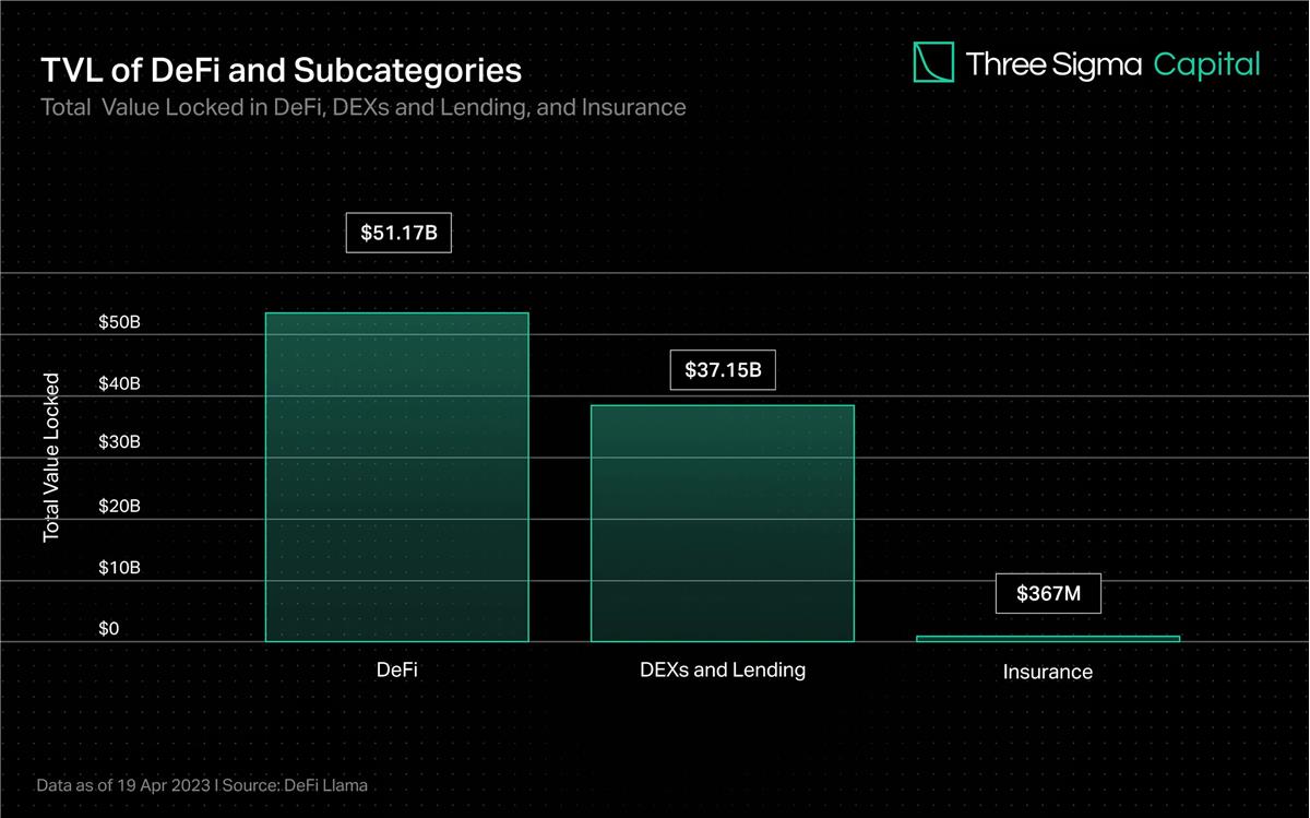 尽管去中心化交易所和借贷占据了 DeFi 锁定价值的大部分份额,保险仅占总价值的不到 1%。然而,随着总锁定价值的增长,智能合约漏洞或其他攻击向量可能造成的潜在损失也随之增加。类似于传统金融市场中的安全网,保险解决方案类似于传统金融市场中的安全网,可能需要投资者、散户和机构放心地参与链上市场。